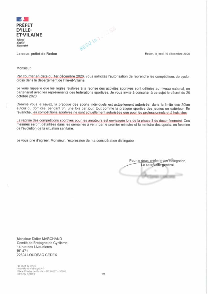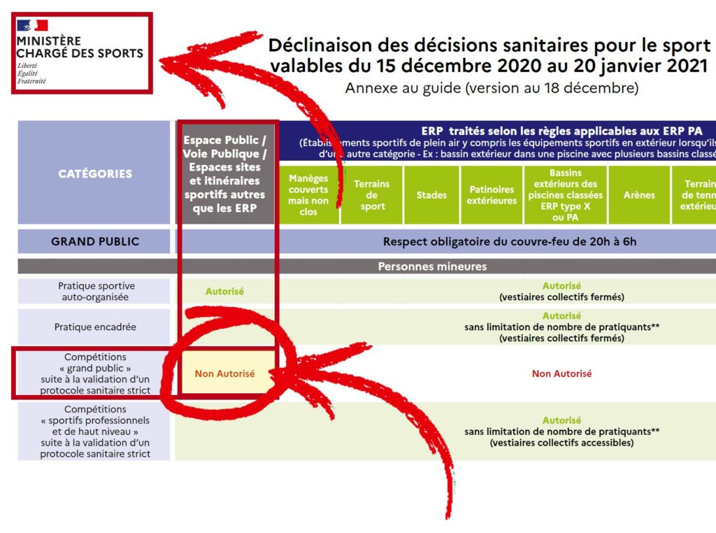 Comme le stipule le tableau récapitulatif de ce qui est permis ou non et diffusé par le Ministère Chargé des Sports et la réponse de la Préfecture d’Ille-et-Vilaine reçue suite au courrier adressé début décembre par le Comité de Bretagne de Cyclisme aux quatre préfectures bretonnes, jusqu’au 20 janvier 2021, il nous est impossible d’organiser des compétitions « grand public » à destination des personnes mineures et majeures.