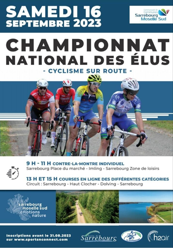 Pour celles et ceux qui souhaiteraient participer à cette belle fête, voici en pièce-jointe l’affiche de la manifestation, ainsi qu’un lien vers le programme des réjouissances et les modalités d’inscription : https://www.sportsnconnect.com/calendrier-evenements/view/15096/championnat-national-cycliste-des-elus.