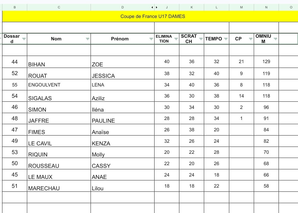 (3 premières places qualificatives pour la finale piste du 14/15 septembre à Limoges)