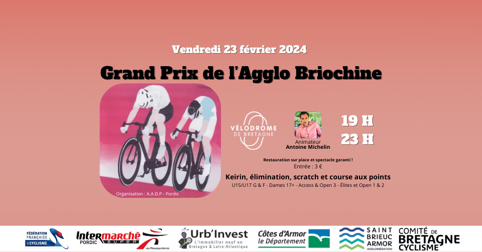 Une nouvelle compétition aura lieu au Vélodrome de Bretagne, la deuxième depuis le début de l’année 2024 ! Celle-ci sera organisée par l’A.A.D.P – Pordic le vendredi 23 février prochain. Elle se déroulera de 19h00 à 23h00 et sera animée par le speaker Antoine MICHELIN.