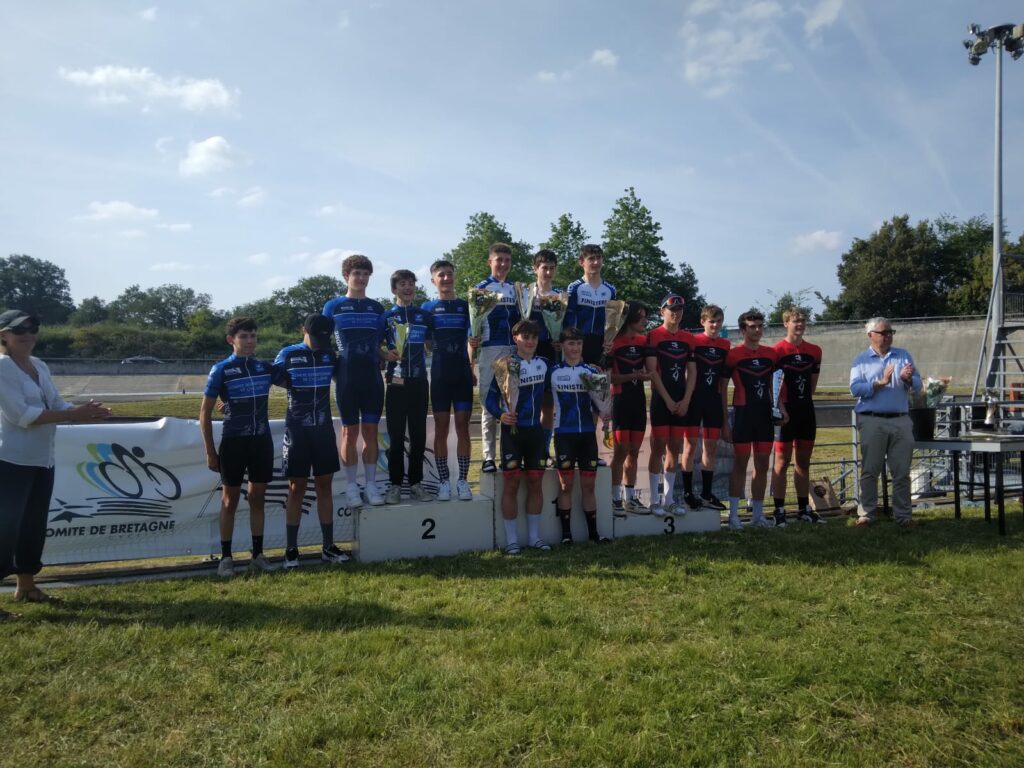 Chez les garçons U17, le classement se fait uniquement par équipe, et il fallait terminer dans les 5 premières équipes pour accéder à la Finale. Avant cette dernière manche le Finistère était 5ème, quelques points derrière le 4eme mais seulement quelques points d’avance sur les 6eme, 7eme et 8eme. Cette manche piste était donc très importante. Baptiste Morizur, Clément Le Fur, Hugo Dalla Torre Joulka, Julian Le Her et Maé Hourmant composaient l’équipe. Nos garçons ont trouvé une énergie collective pour aller remporter cette manche piste (et devenir “les seigneurs de l’anneau”).