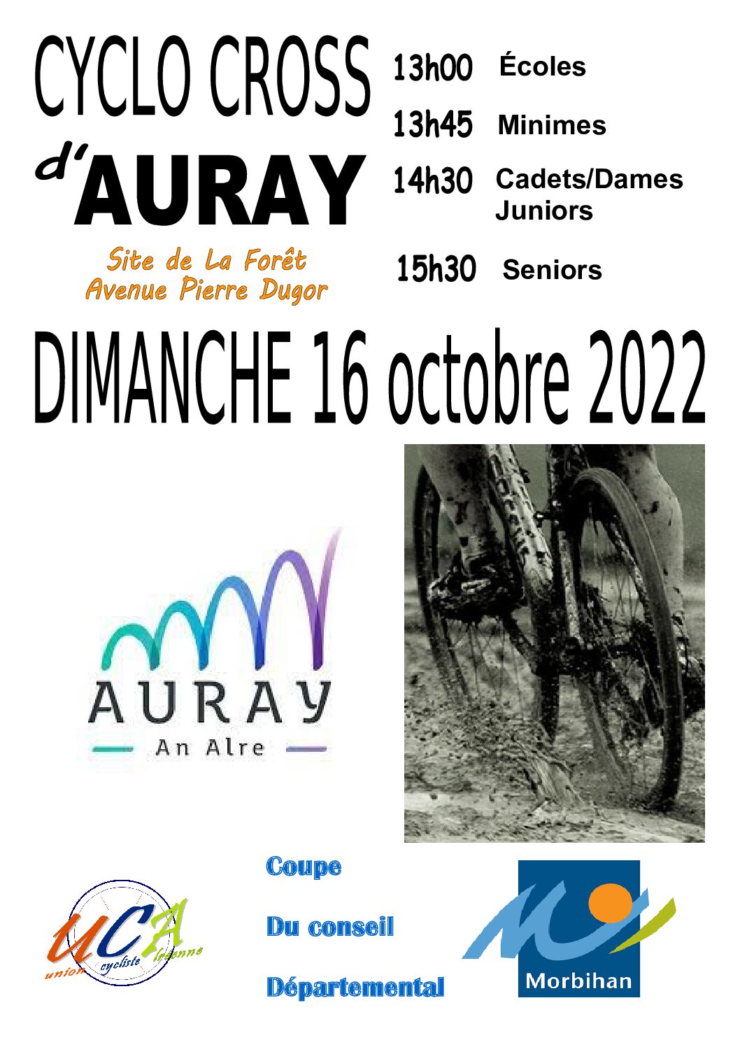 Lieu de l'épreuve: site de la Forêt, Avenue Pierre DUGOR à Auray Ecole de cyclisme - U7 H/F à U13 H/F: Départ: 12h30 Distance selon l'âge Engagements: 2€   U15 H/F: Départ: 13h30 20 mn Engagements: 6.50€   U17 H/F: Départ: 14h15 30 mn Prix coureurs: 61/5, 1er 21€ Engagements: 6.50€   U19 H: Départ: […]