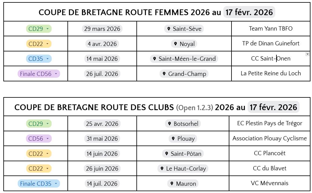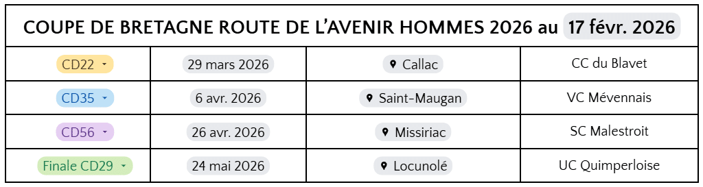 Accueil Mise en avant A la Une Route | Agenda des Coupes de Bretagne 2026 Mise en avantA la UneAu cœur de l'actualitéCoupe de BretagneL'officielDisciplinesRoute Route | Agenda des Coupes de Bretagne 2026 Par Dany - 24 février 2026 Retrouver ci-dessous le calendrier des Coupes de Bretagne 2026 :