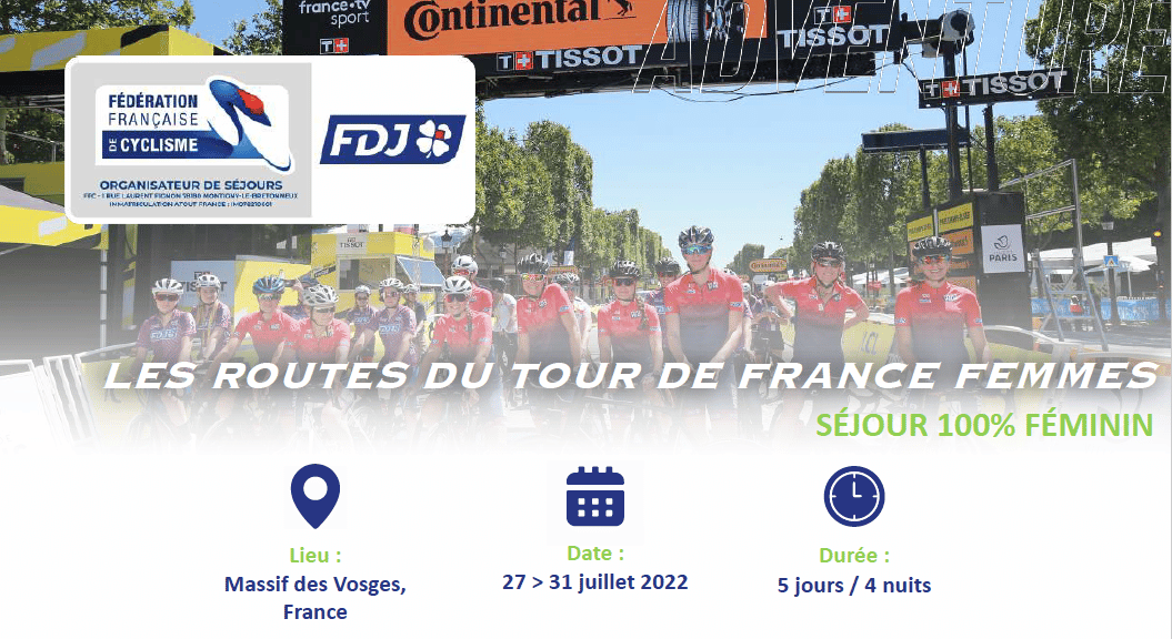 Du 27 au 31 juillet, participez à un stage FFC Tour de France Féminin dans le Massif des Vosges encadré par un staff 100% féminin. Julie BRESSET (Championne Olympique de VTT à Londres en 2012), Marine STRAPPAZZON (coureuse élite) et les Ambassadrices de la FFC vous partageront tous leurs conseils durant ces 5 jours.