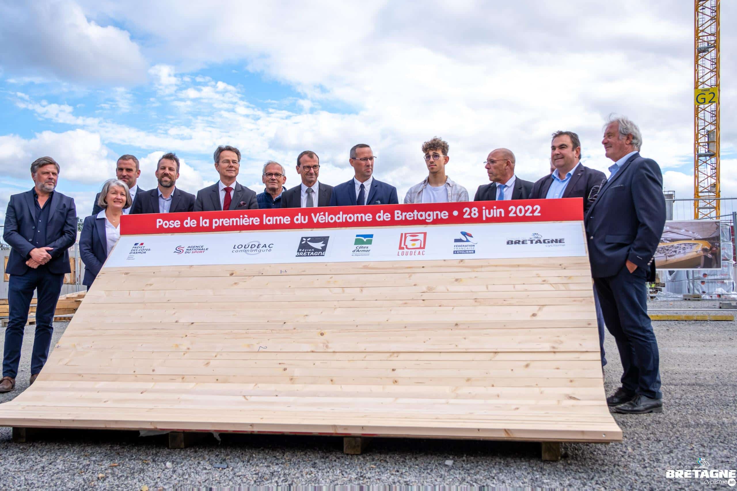 La cérémonie de pose de la première lame du vélodrome couvert de Loudéac s’est tenue ce mardi 28 juin 2022 en présence notamment des élus locaux, du Préfet des Côtes d’Armor, du Vice-président de la Région en charge des sports M. Pierre POULIQUEN et de M. Michel CALLOT, Président de la FFC.